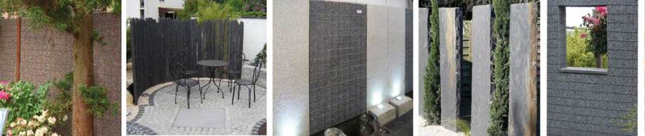 Als Sichtschutz dienen Schiefer- oder Granitplatten mit Sockel. Diese können auch hervorragend mit Gabionen, bzw. Spittkörben kombiniert werden.